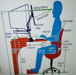 • Sit up straight: Make sure that you sit tall with weight on the buttocks and feet. The Pelvis should be straight up and down. Chairs with adjustable backs and arms.